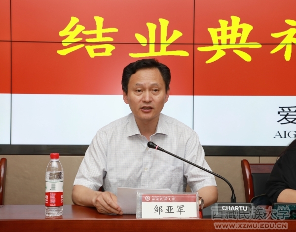 邹亚军代表学校党委、行政向全体学员的顺利结业表示祝贺,向教育厅长期以来的坚强领导和关心表示衷心的感谢。他指出,本期培训班是在全区教育工作者深入学习贯彻习近平总书记在全国教育大会上的重要讲话精神,深入贯彻落实全国思想政治教育大会精神,深入学习贯彻习近平总书记致西藏民族大学建校60周年贺信精神的重要时期,是在全区各级全面启动“六卓越一拔尖”计划2.0,落实教育部“双万计划”、加快西藏高等教育现代化进程的关键时刻开展的一次重要培训工作。这次培训时间紧、任务重,但主题鲜明,内容丰富,安排紧凑,针对性强。他总结到,从学员通过此次培训的过程和效果看,有三个方面值得总结和深化。一是培训目标明确,培训计划周密。二是培训内容丰富,课程安排充实。三是学员管理严格,任务落实到位。他希望,学员们不要忘记这次培训学习收获,深刻理解以习近平同志为核心的党中央全面从严治党的新内涵,深刻领会新时代党性修养的新要求,增强贯彻中央和自治区党委、政府决策部署的思想自觉和行动自觉,坚持立德树人,强化思想引领,以更强的本领、更优的作风、更好的精神状态,努力推动我区教育事业科学发展。同时,他也从援藏干部的角度客观地评价了目前学校的师资队伍建设等相关情况,诚挚地希望教育厅一如既往地支持民大的可持续发展,给予民大更多的关心和政策性支持。