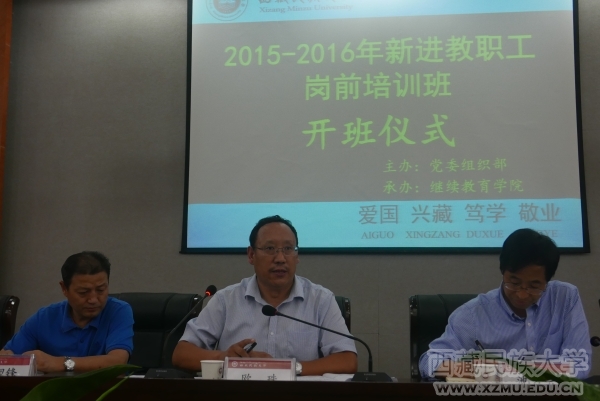 9月26日晚上,学校2015—2016年新进教职工岗前培训班开班仪式在一号办公楼五楼会议室隆重举行。学校党委副书记、副校长欧珠出席开班仪式并作重要讲话,党委常委、副校长池万兴主持开班仪式,组织部、教务处、学工部(处)、科研处、继续教育学院、管理学院等相关部门负责同志,2015—2016年全体新进教职工,共计120余人参加开班仪式。